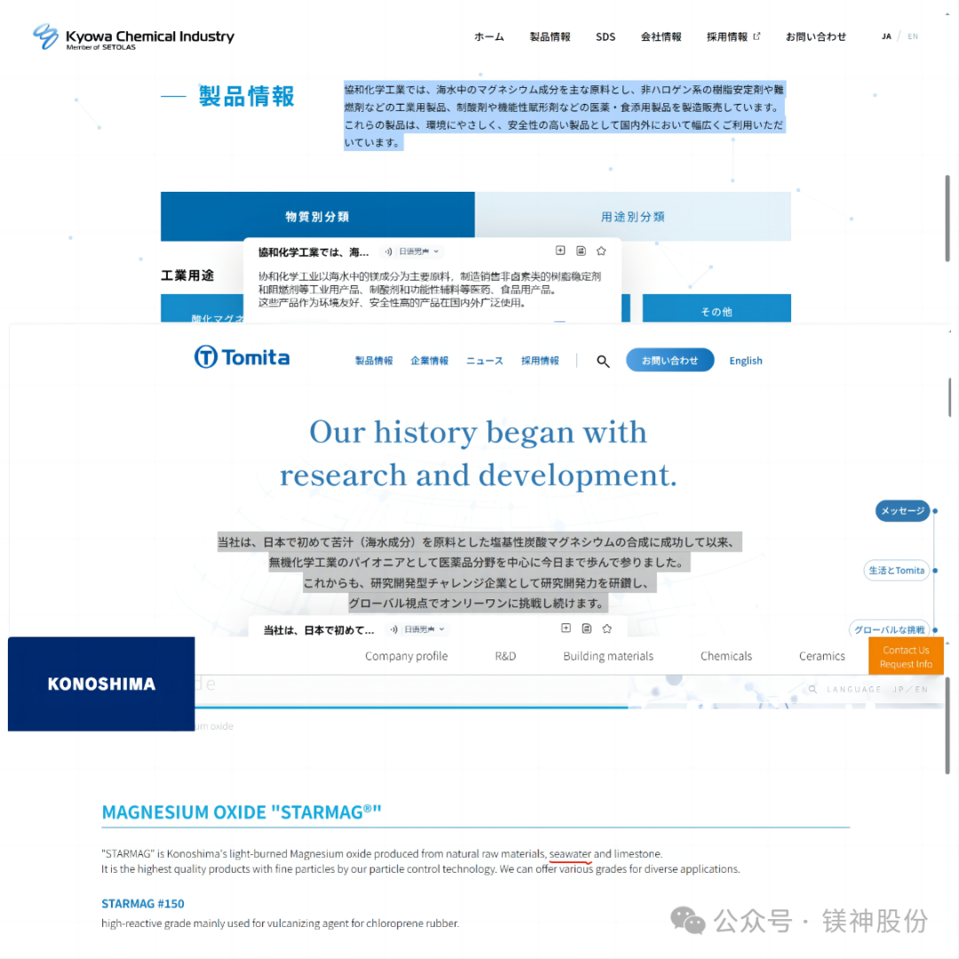 日本自核污水排海后已發(fā)生多起“因食用當?shù)睾ur引起食物中毒”、“當?shù)睾┥铣霈F(xiàn)大量異常死亡海鮮”類似事件,同樣是來自于海水的日本鎂鹽其對人類的危害程度可想而知。更令人擔心的是日本主要鎂鹽生產(chǎn)企業(yè)(日本神島化學(xué)有限公司、日本協(xié)和化學(xué)工業(yè)有限公司、日本富田制藥株式會社、日本宇部株式會社、日本達泰豪化工工業(yè)株式會社)都是采用海水法進行生產(chǎn)。在生產(chǎn)過程中會對海水進行濃縮處理,致使鎂鹽原料鹽水鹵中的放射性物質(zhì)濃度遠超被核廢水污染的海水,必定導(dǎo)致所鎂鹽中的放射性物質(zhì)超標。