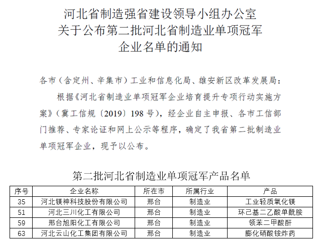 新年新氣象,企業(yè)再添新榮譽(yù),爭(zhēng)得開門紅,近日,河北省工業(yè)和信息化廳官方網(wǎng)站公布了2020年“制造業(yè)單項(xiàng)冠軍產(chǎn)品”企業(yè)名單,我公司生產(chǎn)制造的“工業(yè)輕質(zhì)氧化鎂”獲得了河北省制造強(qiáng)省建設(shè)領(lǐng)導(dǎo)小組授予的“制造業(yè)單項(xiàng)冠軍產(chǎn)品”稱號(hào)。本次邢臺(tái)市通過(guò)4家,我們是其中1家。